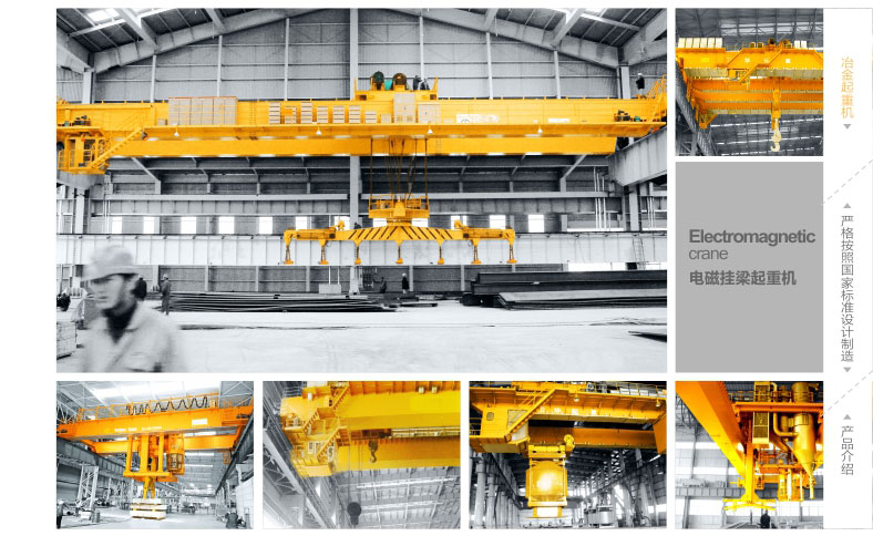 1、 本起重机带有可拆卸的电磁盘,特别适用于搬运具有导磁性的黑色金属制品与材料,如钢锭、型钢、生铁块等。主要用于钢铁企业轧线、成品库,船厂钢料堆场、下料车间等。