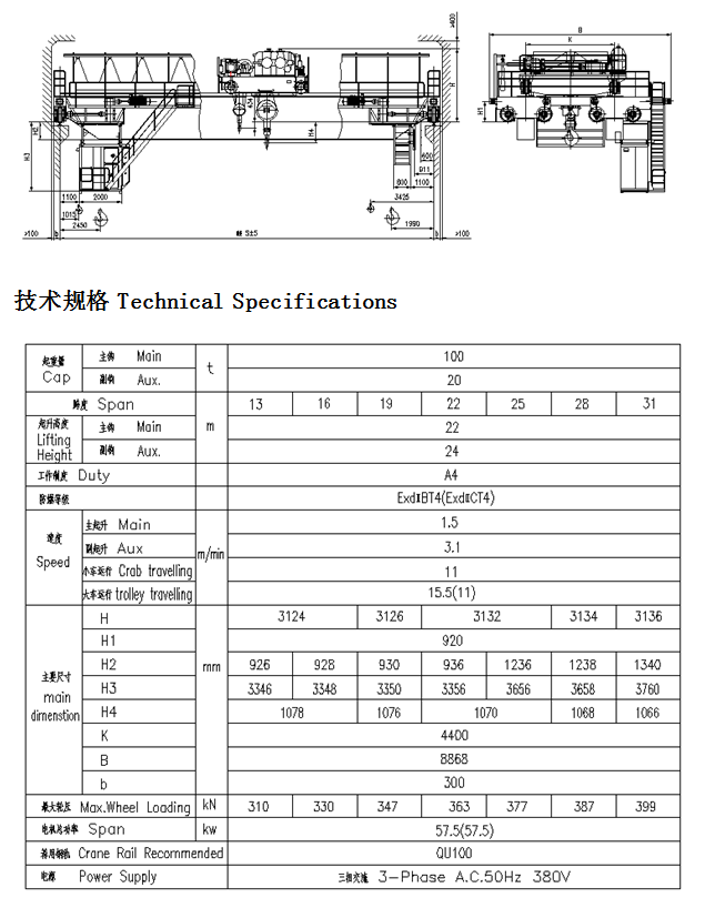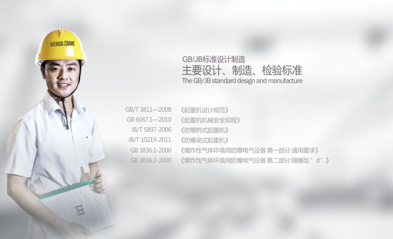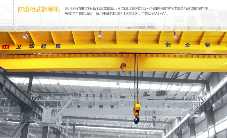 1、 QB型防爆吊钩桥式起重机所有电机、电器防爆性能符合GB3836.2-2000《爆炸性气体环境用防爆电气设备第2部分:隔爆型“d”》,整机性能符合JB/T5897-2006《防爆桥式起重机》标准之规定,经国家指定的防爆产品检验单位检验合同,取得了《防爆合格证》。防爆标志分别为ExdⅡBT4、ExdⅡCT4。