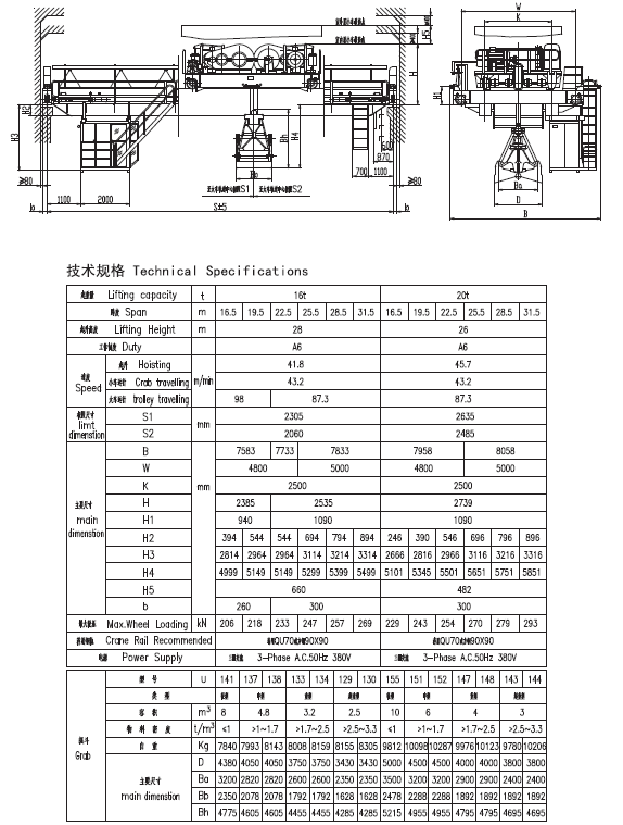 6、 取物装置为双卷筒的四绳抓斗,结构简单,工作可靠。抓斗可在任意高度张开和闭合。